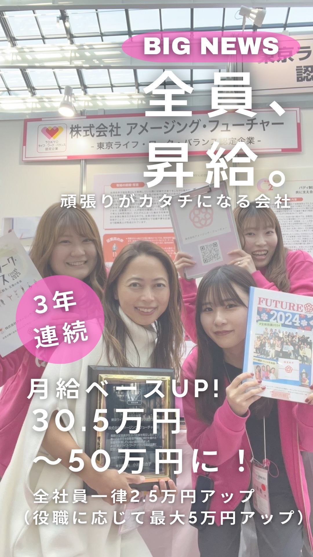 今回は一人あたり2.5万円と過去最大の昇給額で、最大で月5万円のベースアップになった人もいます!実は、アメージング・フューチャーでは毎年全社員の昇給を実現しており、この3年間で、なんと3回も月給ベースアップをしています。