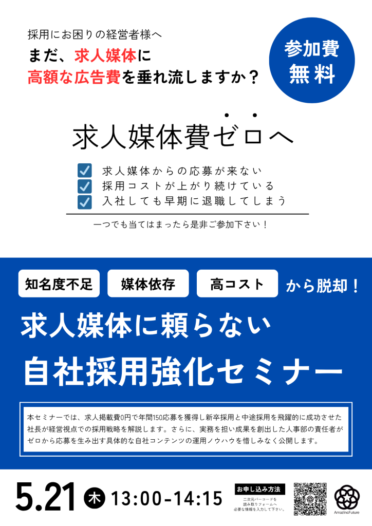 この度、5/21(木)企業様向けの『自社採用強化セミナー』を開催します。