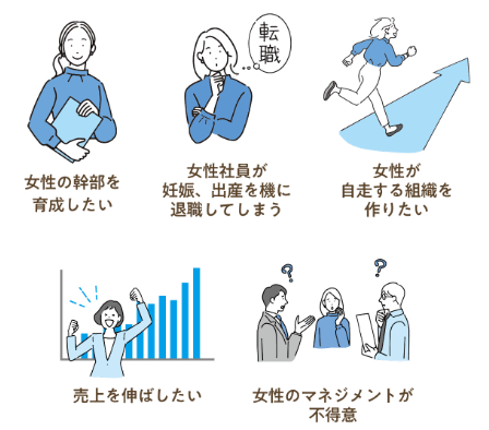 女性社員が自分たちで自分たちの活躍の道を考え、自分たちが活躍したい会社を作る主体的な組織作りのお手伝いを、伴走しながら行います。